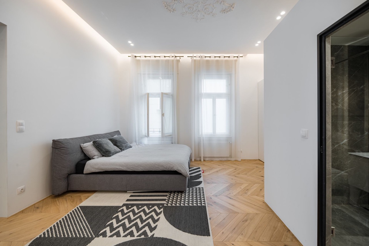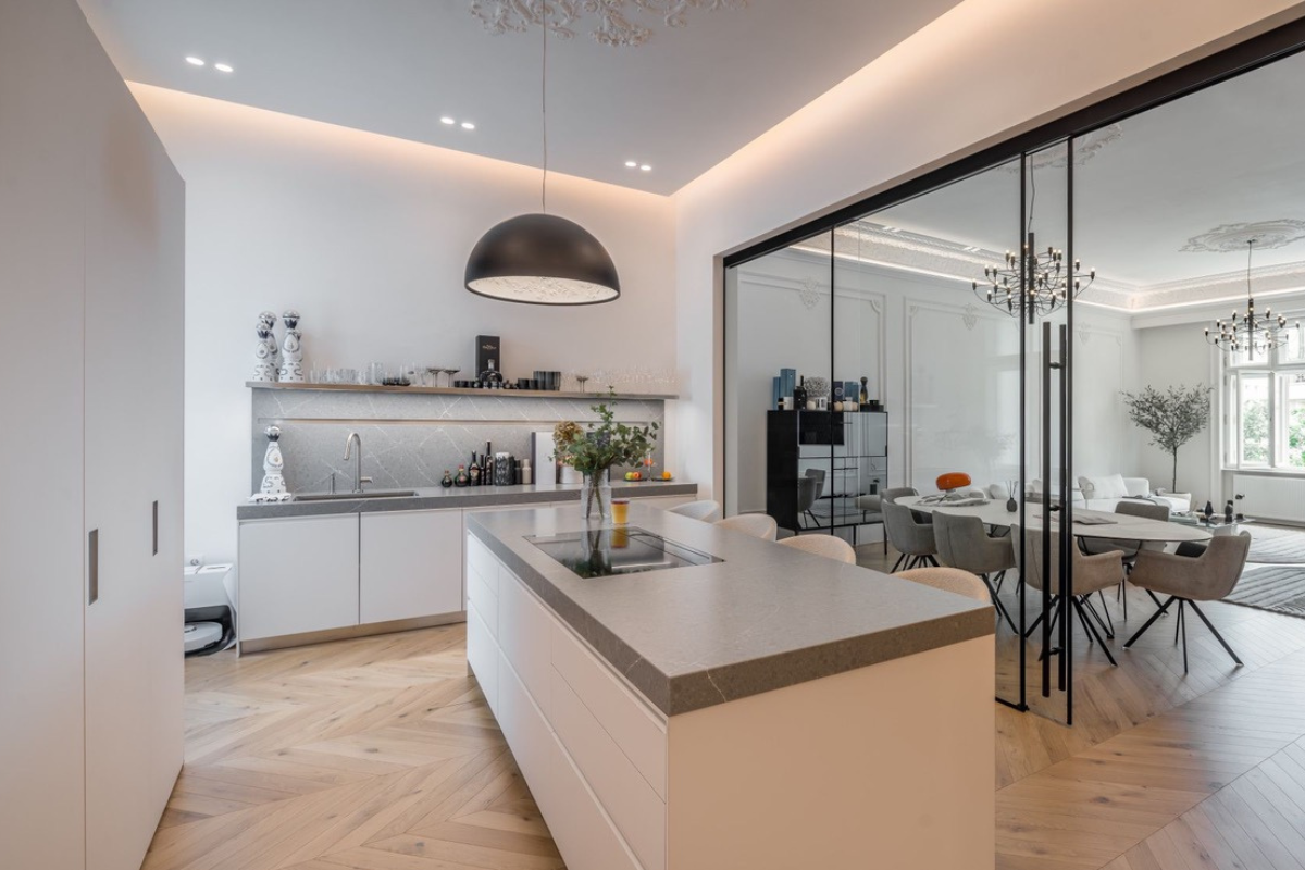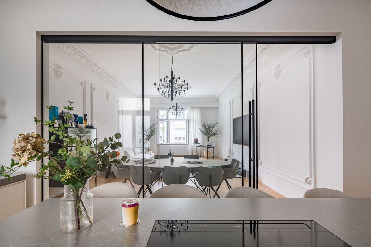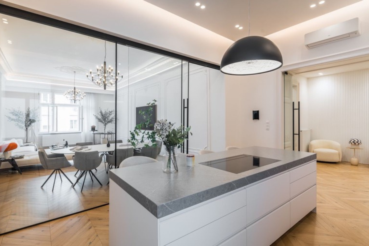 A tágas nappali-étkező egy légtérben helyezkedik el, hatalmas belmagassággal, díszített stukkókkal és látványos csillárokkal, amelyek karakteres, mégis könnyen alakítható vizuális hátteret biztosítanak. A térből üveg tolóajtókon keresztül nyílik a modern, minimalista Arclinea konyha, amely rejtett megoldásaival és letisztult felületeivel kontrasztot ad a klasszikus enteriőrnek. A lakás egészét egységes tölgyfa parketta borítja, amely tovább erősíti a prémium, mégis otthonos hangulatot. A három hálószoba mindegyike saját fürdőszobával rendelkezik, a master bedroom pedig projektorral felszerelt.