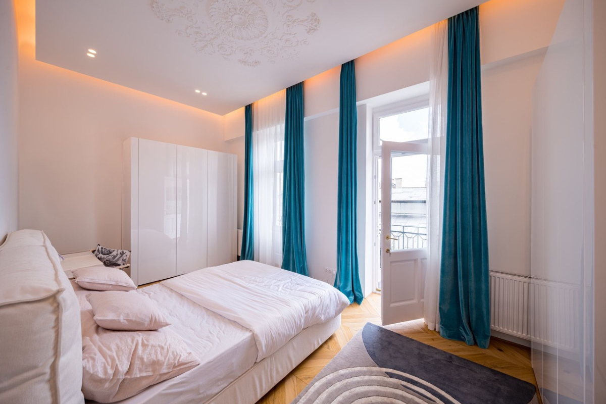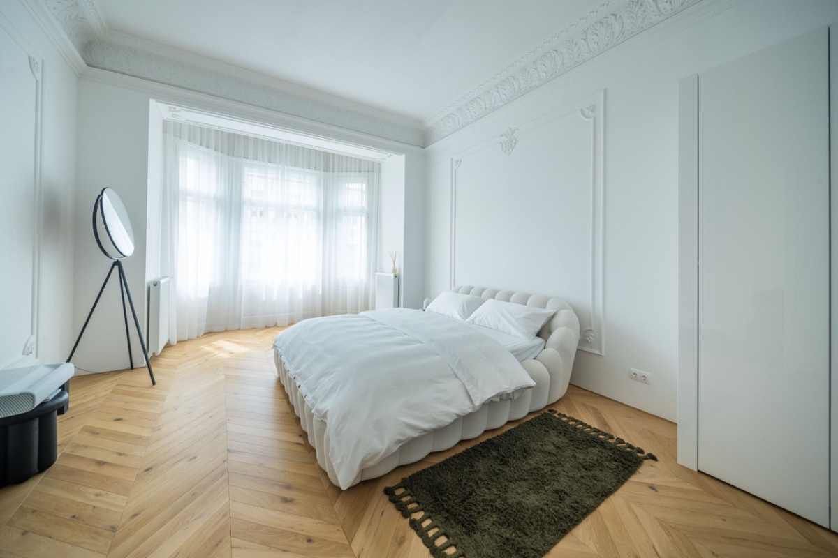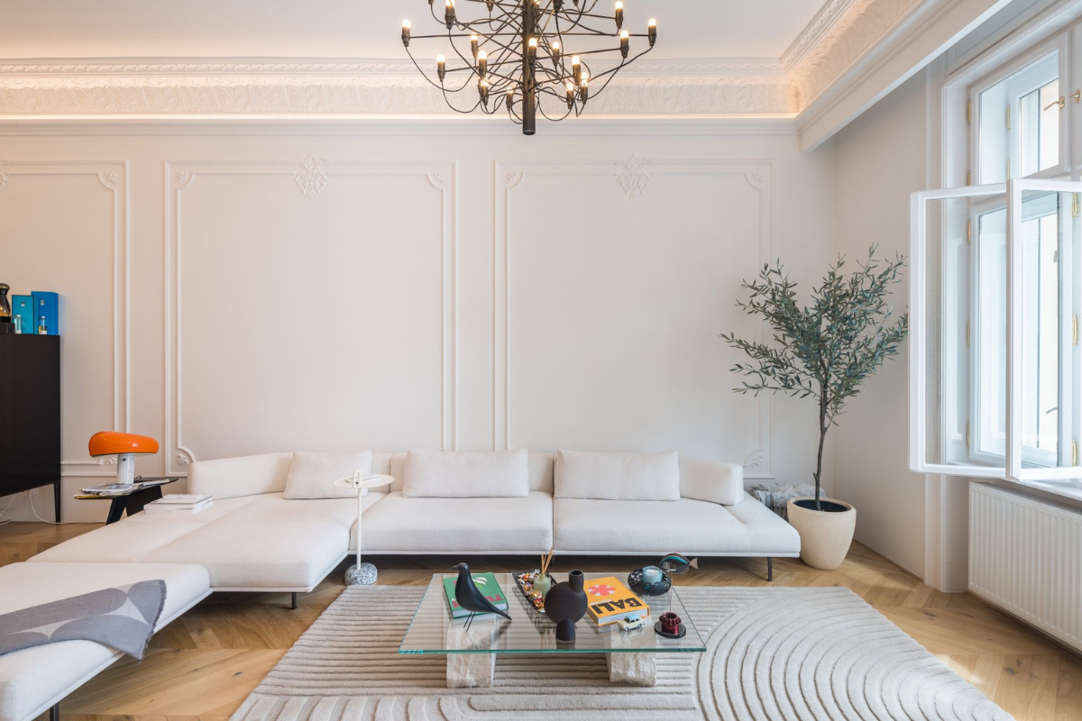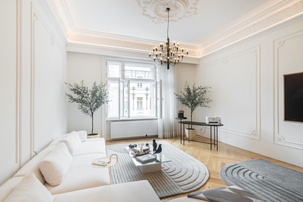 A tágas nappali-étkező egy légtérben helyezkedik el, hatalmas belmagassággal, díszített stukkókkal és látványos csillárokkal, amelyek karakteres, mégis könnyen alakítható vizuális hátteret biztosítanak. A térből üveg tolóajtókon keresztül nyílik a modern, minimalista Arclinea konyha, amely rejtett megoldásaival és letisztult felületeivel kontrasztot ad a klasszikus enteriőrnek. A lakás egészét egységes tölgyfa parketta borítja, amely tovább erősíti a prémium, mégis otthonos hangulatot. A három hálószoba mindegyike saját fürdőszobával rendelkezik, a master bedroom pedig projektorral felszerelt.